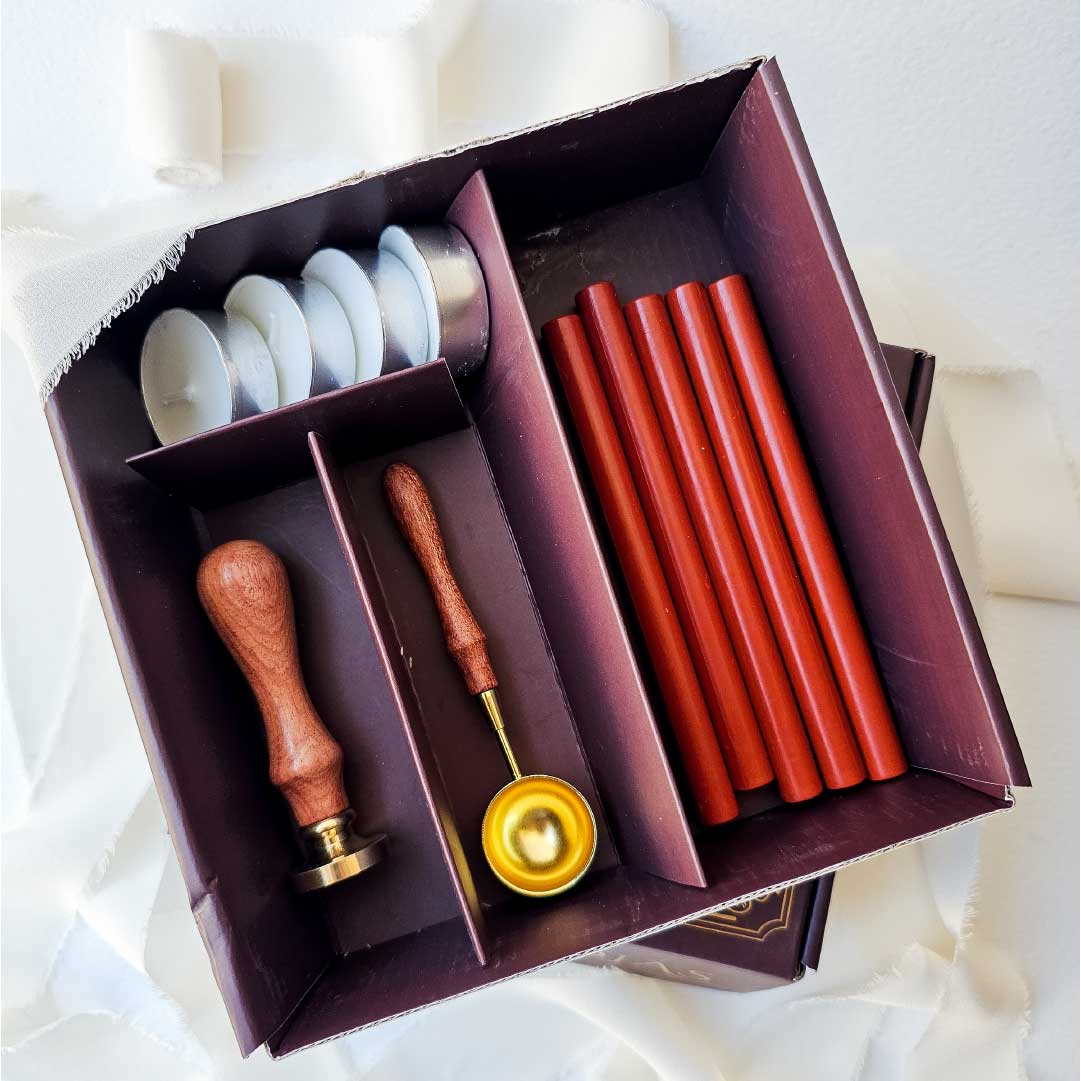 Este Set es perfecto para quienes desean realizar sus sellos en cantidad, ya que es más rápido con una pistola de Silicon(opcional). Incluye: 1 mango se madera con diseño de catálogo 1 cuchara especial de madera 6 barras de lacre (hasta 3 colores a elegir) 1 sobre de regalo 4 velitas (usar en caso no aún no se cuente con la pistola)